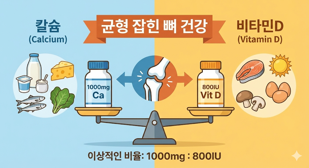 칼슘과 비타민D는 뼈 건강을 위한 ‘재료’와 ‘운반자’입니다. 이상적인 섭취 비율은 칼슘 1000mg : 비타민D 800IU 수준으로 유지하며, 음식과 보충제를 조합해 꾸준히 관리해야 합니다. 일시적 고용량보다 매일 꾸준한 섭취가 핵심입니다. 뼈는 하루아침에 약해지지 않듯, 건강한 뼈도 지속적인 균형 관리에서 만들어집니다.